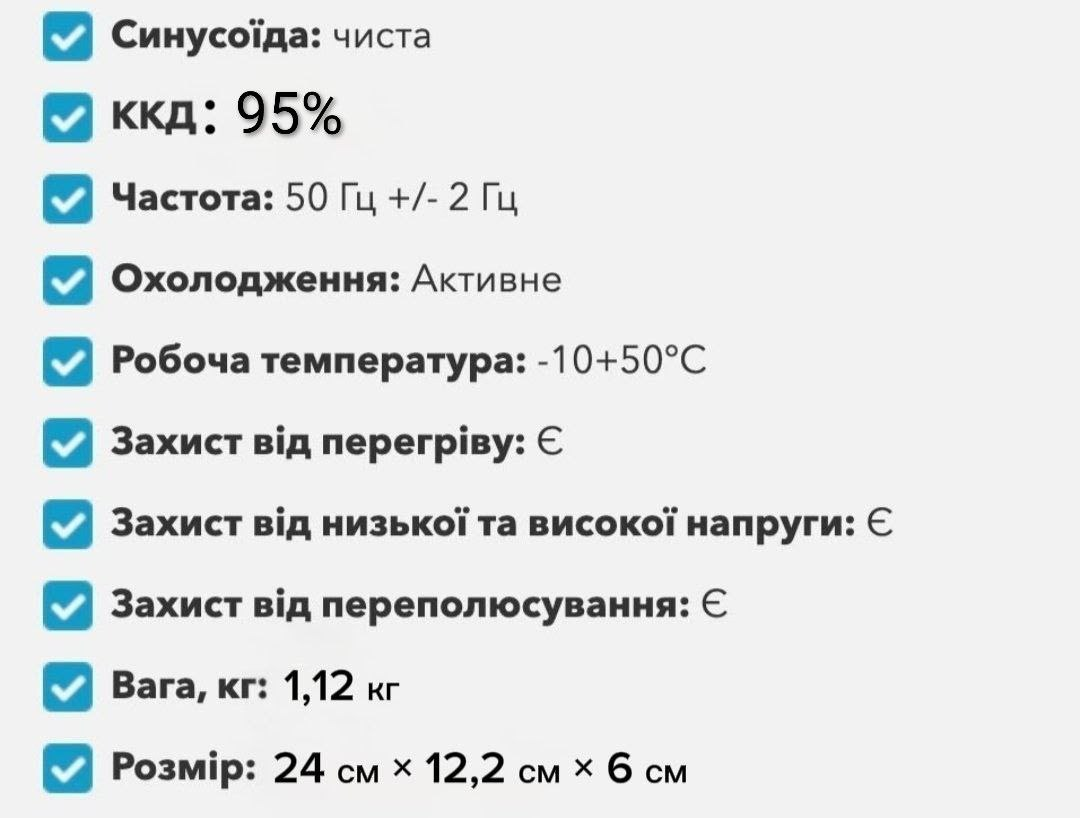 Купила, щоб пережити зиму зі світлом. Це дійсно рятує! Для мене найважливіше — холодильник та Wi-Fi роутер. Холодильник запустився нормально і працював тихо. Ввечері включаємо освітлення і заряджаємо телефони. Дуже просто підключити, розібралася сама за інструкцією. Рекомендую всім, хто хоче мати хоч трохи комфорту.