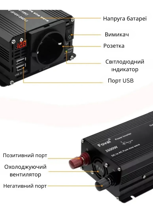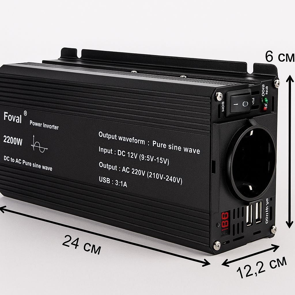 Спочатку був скептичний до заявлених 2200W, тому підключав поетапно: холодильник, роутер, кілька ламп. Потім додав електрочайник (не на максимум). Тримає! Головна перевага цього FOVAL – стабільна напруга. Перевірив мультиметром: коли в мережі стрибки, цей інвертор дає чисті 220V. Це економить купу грошей на ремонті техніки. Рекомендую, хто цінує якість, а не лише ціну.